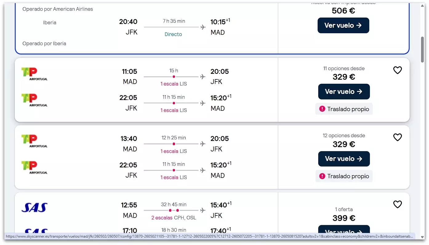⚠️✈️ Encontramos este vuelo muy barato a Nueva York (Estados Unidos), partiendo desde la ciudad de Madrid (España) a solo 329€ ida y vuelta con TAP. Esta oferta tiene una pequeña escala en Lisboa. Incluye equipaje de mano (bolso personal y maleta de cabina).